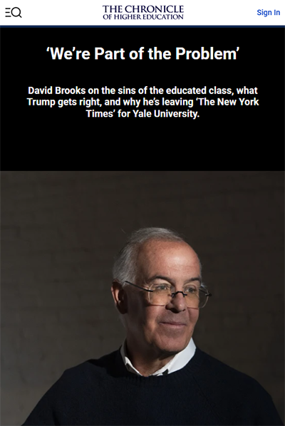 In this Chronicle of Higher Education interview, conducted on his final day at The New York Times, columnist and author David Brooks reflects on how elite educational institutions may have unintentionally deepened social and political divides by privileging status, credentialism, and prestige over character, civic responsibility, and moral formation. Brooks, who is leaving the Times to serve as a presidential senior fellow at Yale’s Jackson School of Global Affairs, argues that universities must confront their role in shaping a meritocratic system that has deepened class divisions and eroded public trust. While sharply critical of political attacks on higher education, Brooks also suggests this is a moment for internal reform, urging institutions to reengage with the enduring human questions at the heart of liberal education. While focused on elite universities, Brooks’s critique carries clear implications for independent schools that espouse whole-child education and character formation. It invites reflection on whether graduates are shaped chiefly by achievement and resume virtues or by empathy, resilience, and civic responsibility. If the former begins to eclipse the latter, then mission statements that champion integrity, service, and moral leadership must be realized not merely in language but in the lived experience of curriculum, advising, community expectations, and daily school culture.