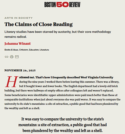 Johanna Winant’s moving ode to close reading is the perfect counterpoint to educators’ feelings of ennui and despair in the current technological and political moment. Winant was an instructor at West Virginia University, one of many institutions “hollowed out” by political and cultural forces. Winant, however, has been heartened by her experience of teaching students the time-tested, labor-intensive, and cognitively challenging task of close reading even in the context of the declining institution. Winant is obviously a skilled, patient teacher, but her commitment to practice and praxis is sure to inspire educators looking for a deeper reflection on why we do what we do. She contextualizes her argument in favor of the pedagogical importance of close reading in a “flurry of books” from the past few years, but she grounds her reflection in her experience working with the wide cross section of students at WVU, “trying to describe how teaching can feel magical” even as she understands the cliche. Part of that magic, as Winant understands, is that teaching means that one is “always learning” from and with one’s students; Winant’s essay is a beautiful encomium to the practice of learning. Winant is candid that writing about teaching is challenging—there’s always something ineffable in the alchemic classroom experience—but Winant’s close reading skills have also made her an incisive writer, and the piece is inspiringly thoughtful about what students learn when they’re taught, and inspired, to close read, to attend and to reflect. Indeed, Winant frames close reading as a practice of sense-making grounded in noticing and good-faith argument. Although Winant reaches for “magic” to describe the transformative power of teaching, she closes by noting that teaching students to close read is a tangible, practical, and necessary skill for the current moment; it is a practice with real power.